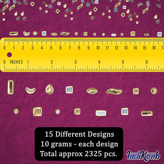 Kundan Stones Set – 15 Assorted Shapes (White & Gold)